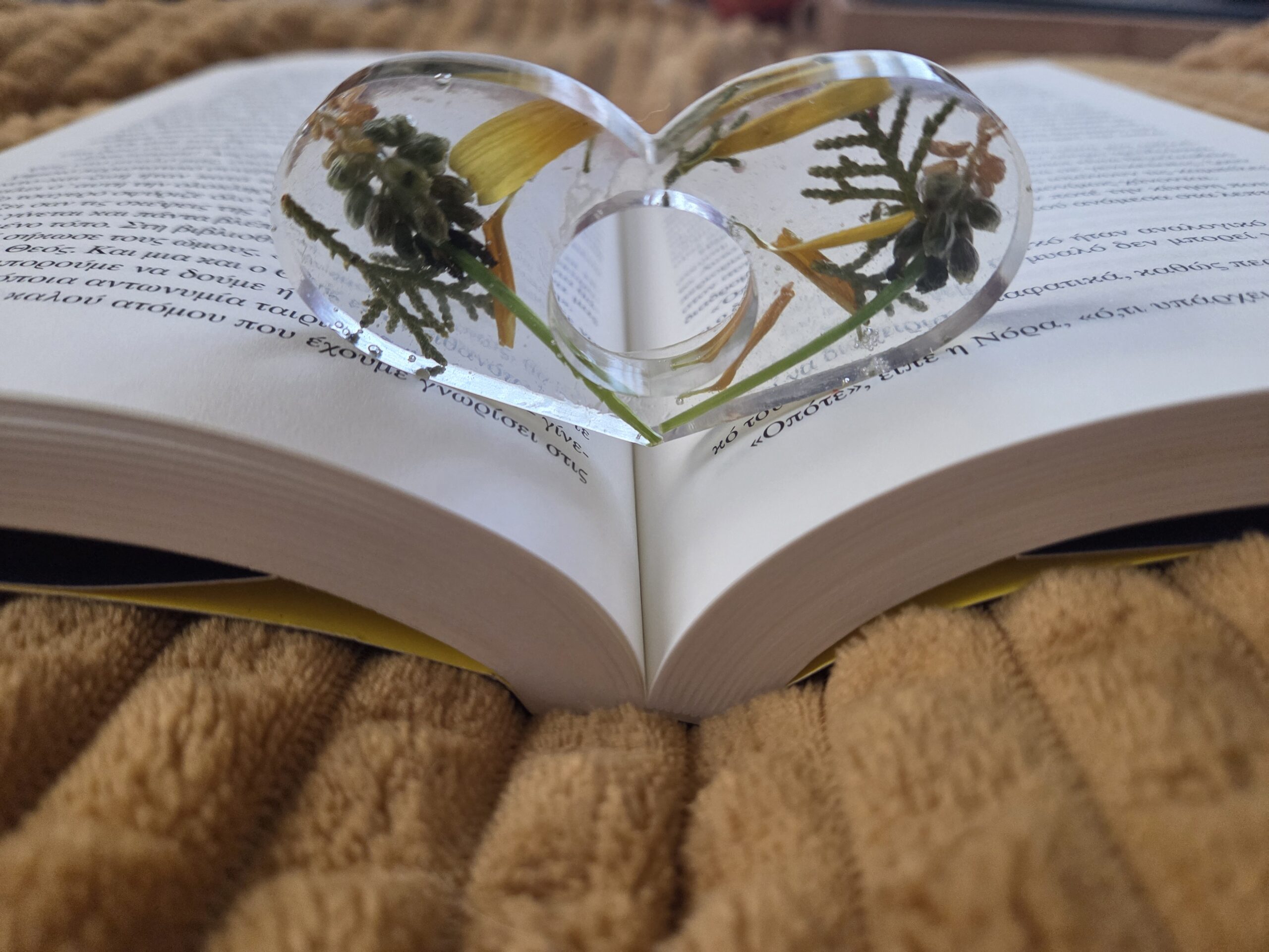 Limited edition χειροποιήτος σελιδοδείκτης δαχτυλίδι φτιαγμένος από υγρό γυαλί με αληθινά λουλούδια.