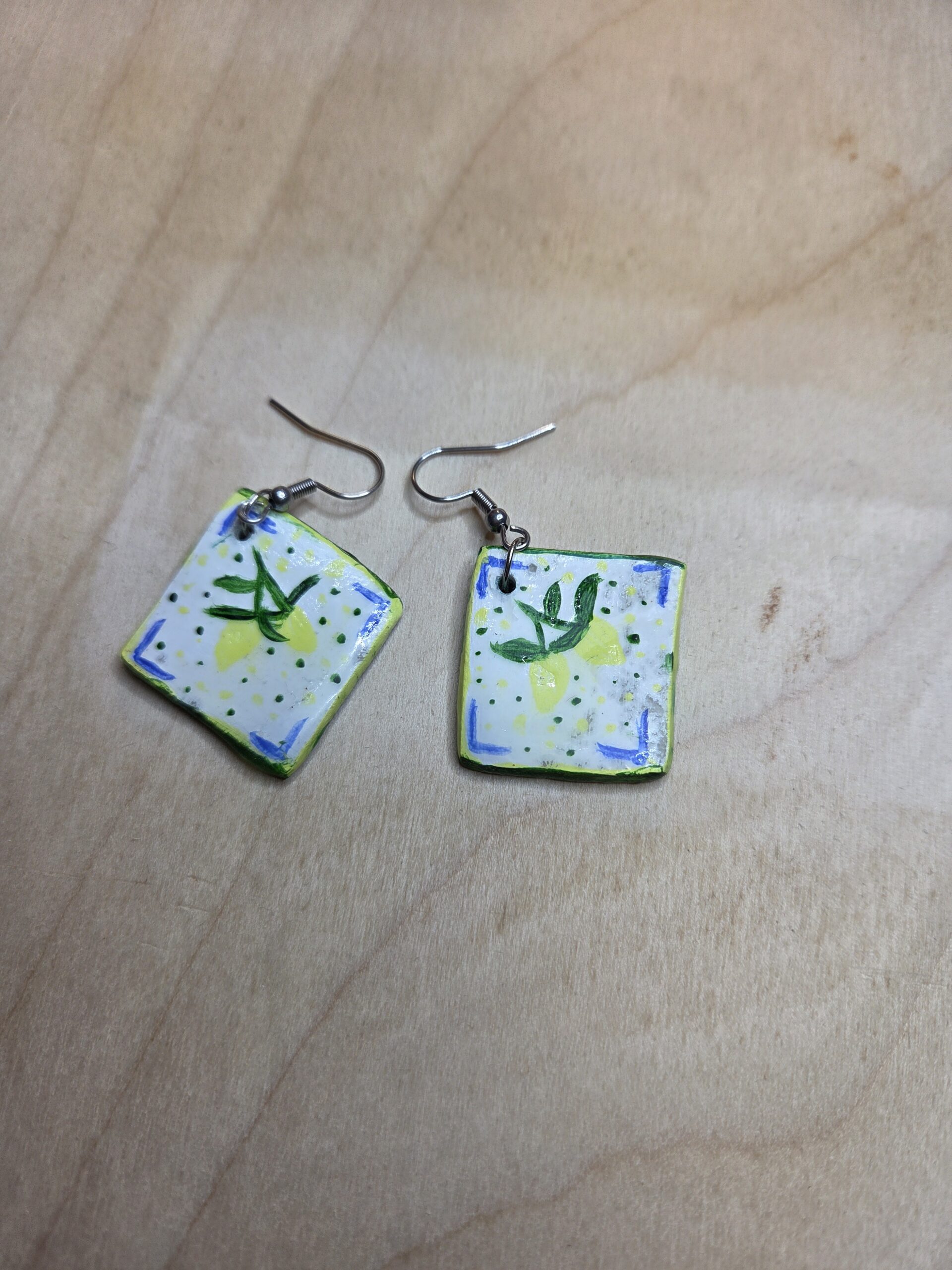 Handmade air clay earrings with stainless steel clasps.